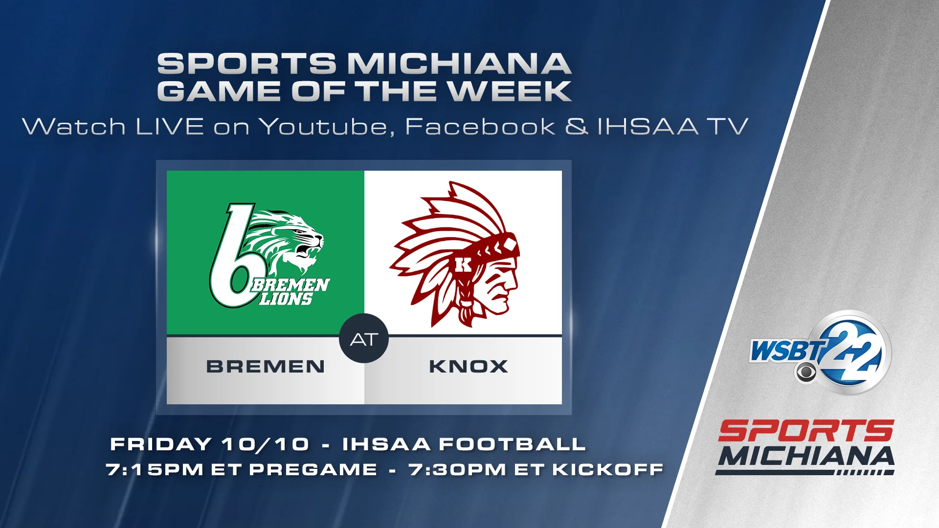 You can watch the game on our Sports Michiana YouTube or Facebook or on our page on IHSAATV. The game will also be available on WSBT’s YouTube or Facebook. Kickoff is set for 7:30pm ET. Pregame coverage begins at 7:15pm ET.